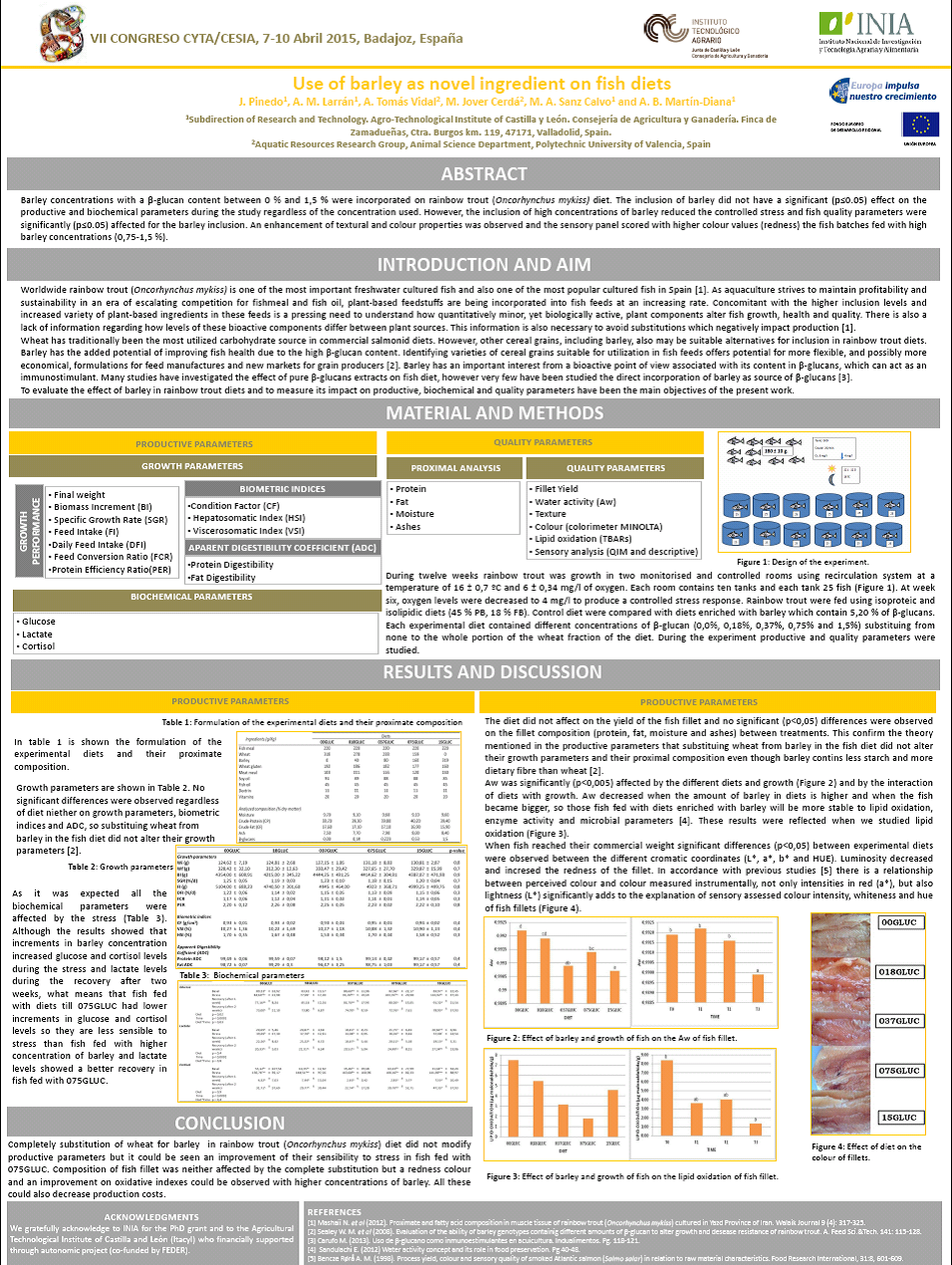 - "Use of barley as novel ingredient on fish diets". VII CONGRESO CYTA/CESIA, 7-10 ABRIL 2015, BADAJOZ, ESPAÑA
